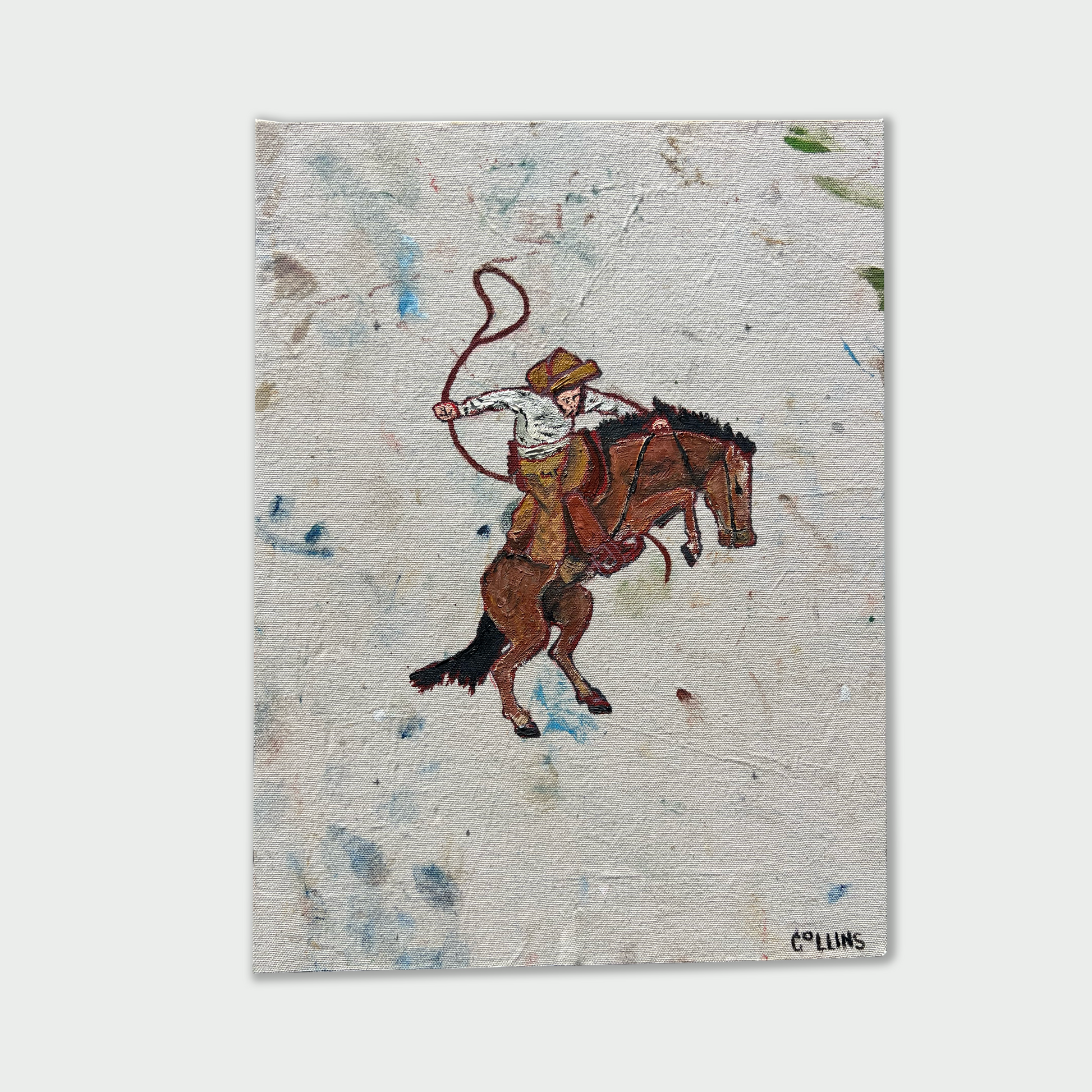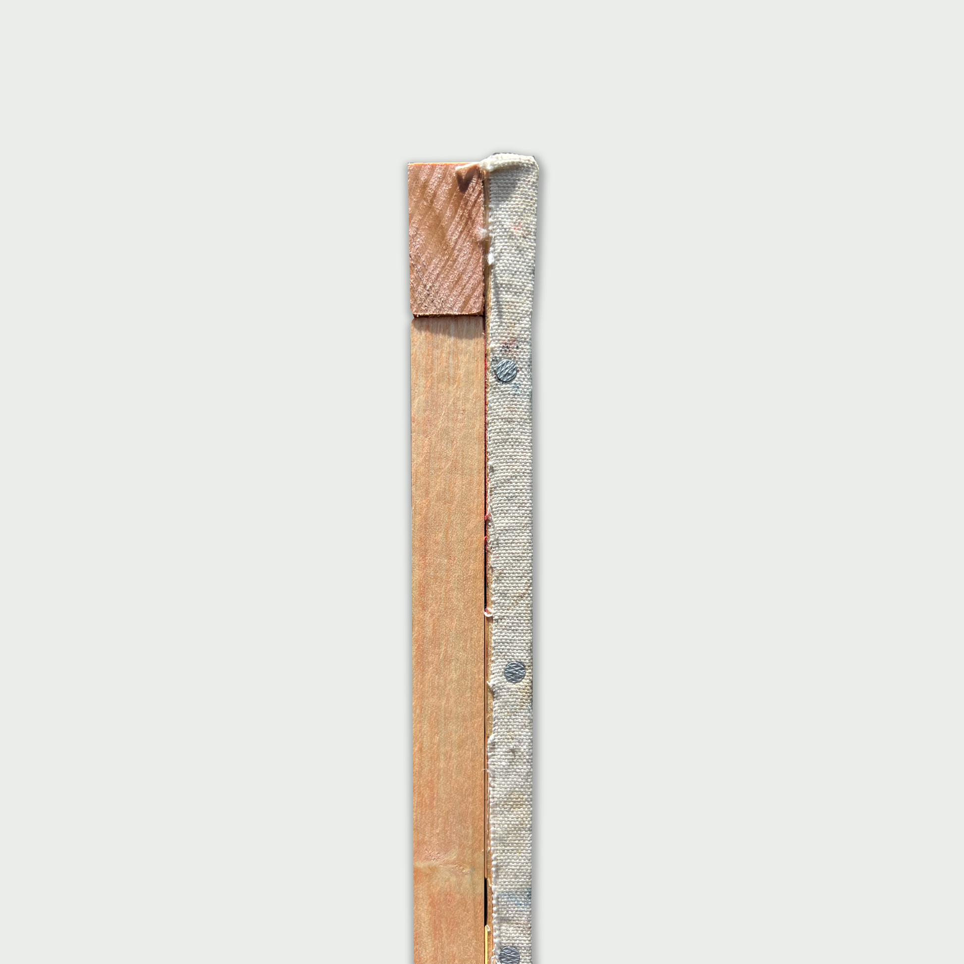 Medium: Original work - Plywood screwed against support beams. Natural canvas dropcloth from studio, stretched over and pinned with nails. Oil paint, oil pastel.